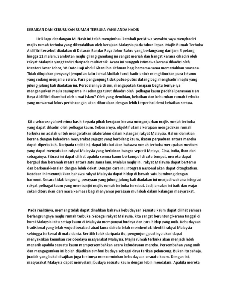 KARANGAN CEMERLANG SPM - Kebaikan Amalan Rumah Terbuka Kebaikan Amalan Rumah Terbuka Amalan rumah terbuka sudah menjadi lumrah untuk sambutan perayaan di negara ini termasuk Hari Raya Aidilfitri Deepavali Tahun Baru Cina dan Hari Krismas. Peribahasa digunakan oleh sesuatu bangsa untuk menonjolkan kebijaksanaan dan. Low Su-Yunn 5A Pada era pascaperindustrian dan pascaglobalisasi yang serba mencabar akal dan minda kita amalan rumah terbuka telah menjadi lumrah pada sambutan hari perayaan bagi masyarakat majmuk di negara Malaysia.